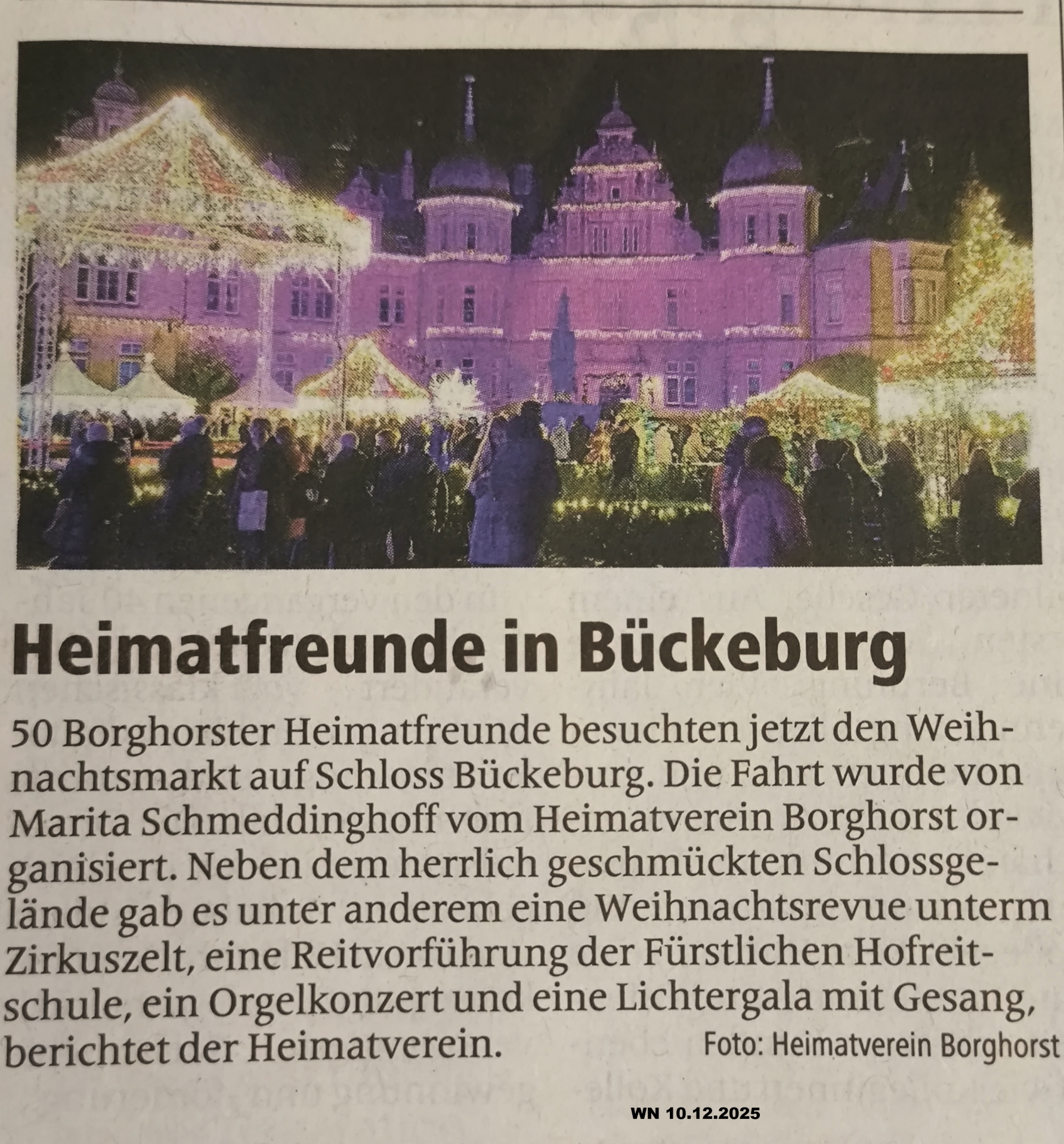 Gut gelaunt startete am 04.12.25 der vollbesetzte Bus mit 50 Heimatfreunden am Borghorster Bahnhof zum Weihnachtsmarkt auf Schloss Bückeburg. Diese Fahrt wurde von Marita Schmeddinghoff vom Heimatverein Borghorst organisiert und war so begehrt, dass noch einige Interessenten auf der Warteliste standen und nicht mitfahren konnten.