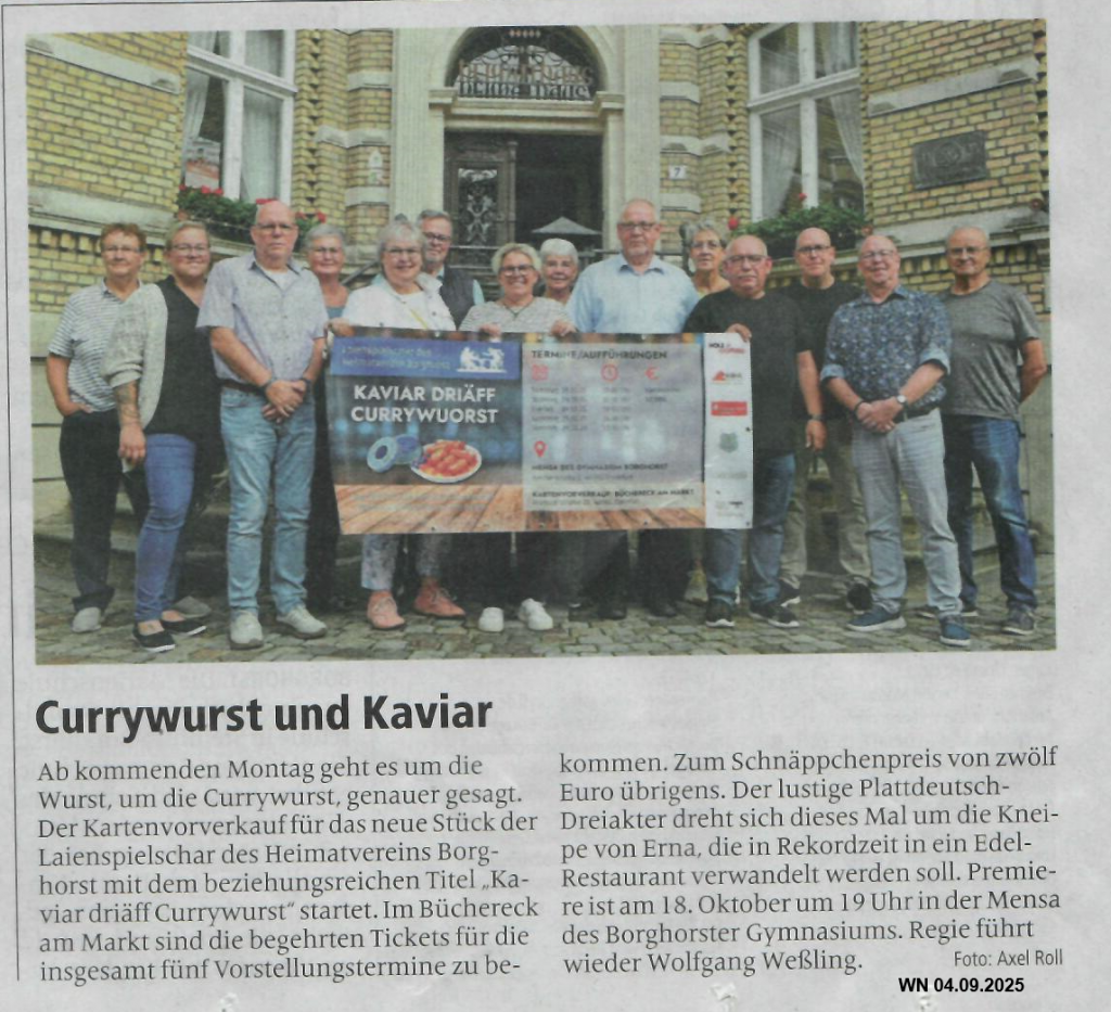 Die Vorstellungen sind am 18. Oktober um 19:00 Uhr, am 19. Oktober um 15:30 Uhr, am 24. Oktober um 19:00 Uhr, am 25. Oktober und am 26. Oktober jeweils um 15:30 festgelegt. Der Vorverkauf startet am 08. September. Dann können im Büchereck, Münsterstraße 26, die Eintrittskarten zum Preis von 12 € erworben werden.