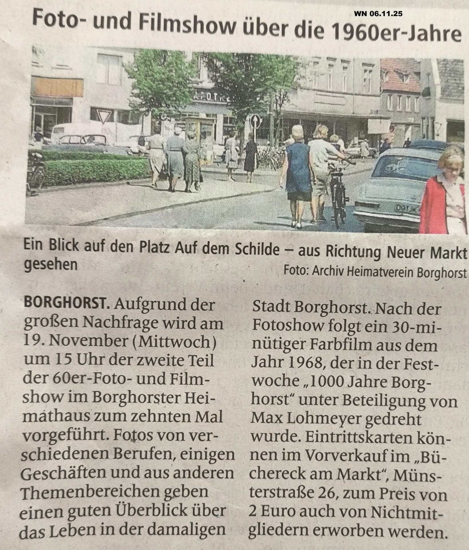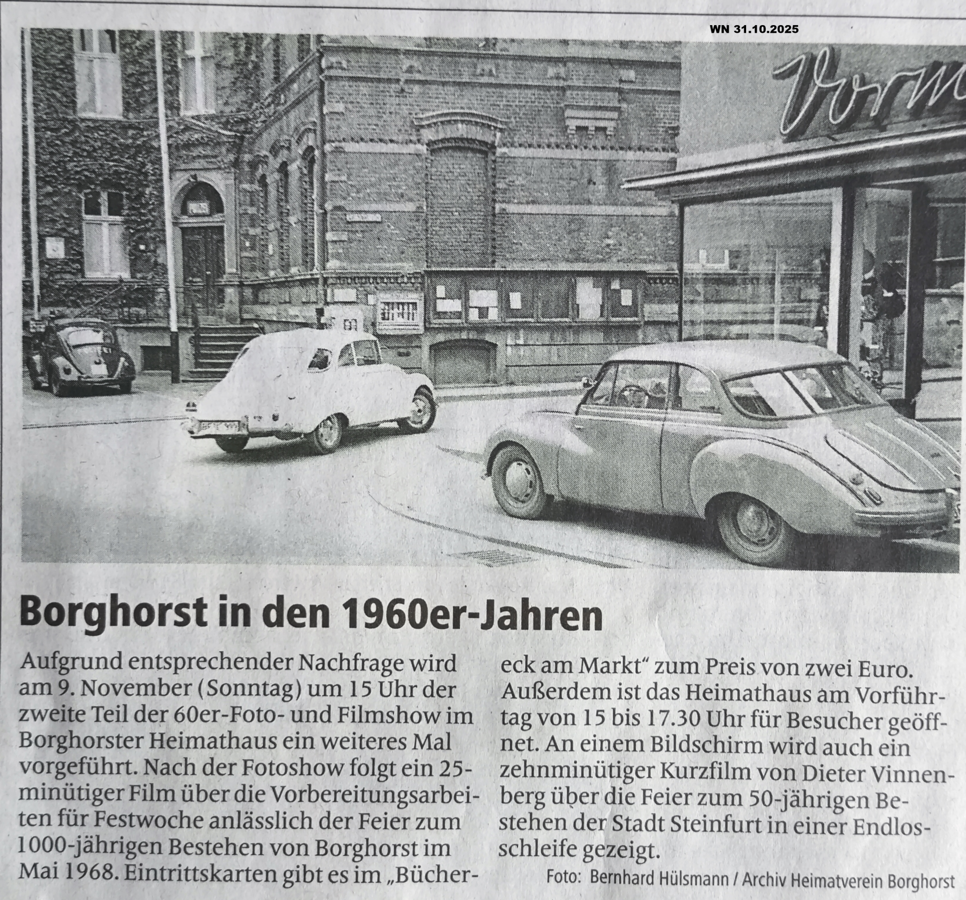 Aufgrund entsprechender Nachfrage wird am 09. November (Sonntag) und am 19. November (Mittwoch) jeweils um 15:00 Uhr der 2. Teil der 60er Foto- und Filmshow im Borghorster Heimathaus zum 10. Mal vorgeführt. Fotos vom neuen Freibad, einigen Geschäften und aus anderen Themenbereichen geben einen guten Überblick über das Leben in der damaligen Stadt Borghorst. Nach der Fotoshow folgt ein 25minütiger Film über die Vorbereitungsarbeiten für die im Mai 1968 stattgefundene Festwoche anlässlich der Feier zum 1000jährigen Jubiläum von Borghorst. Eintrittskarten können im Borghorster Büchereck am Markt, Münsterstr. 26, zum Preis von 2 Euro auch von Nichtmitgliedern erworben werden.