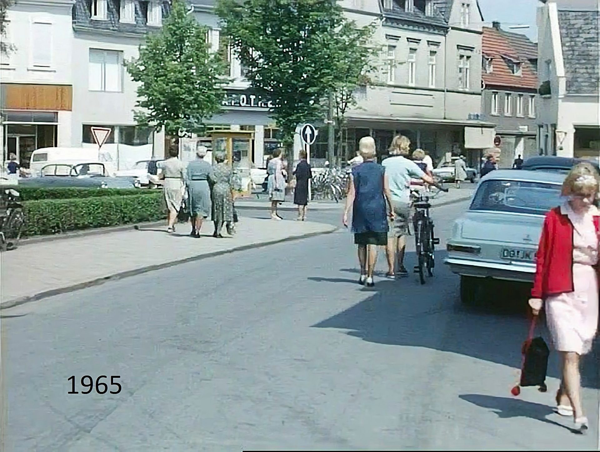 Kopie aus dem Film, Archiv Heimatverein Borghorst. Ein Blick auf den Platz „Auf dem Schilde“ aus Richtung Neuer Markt gesehen