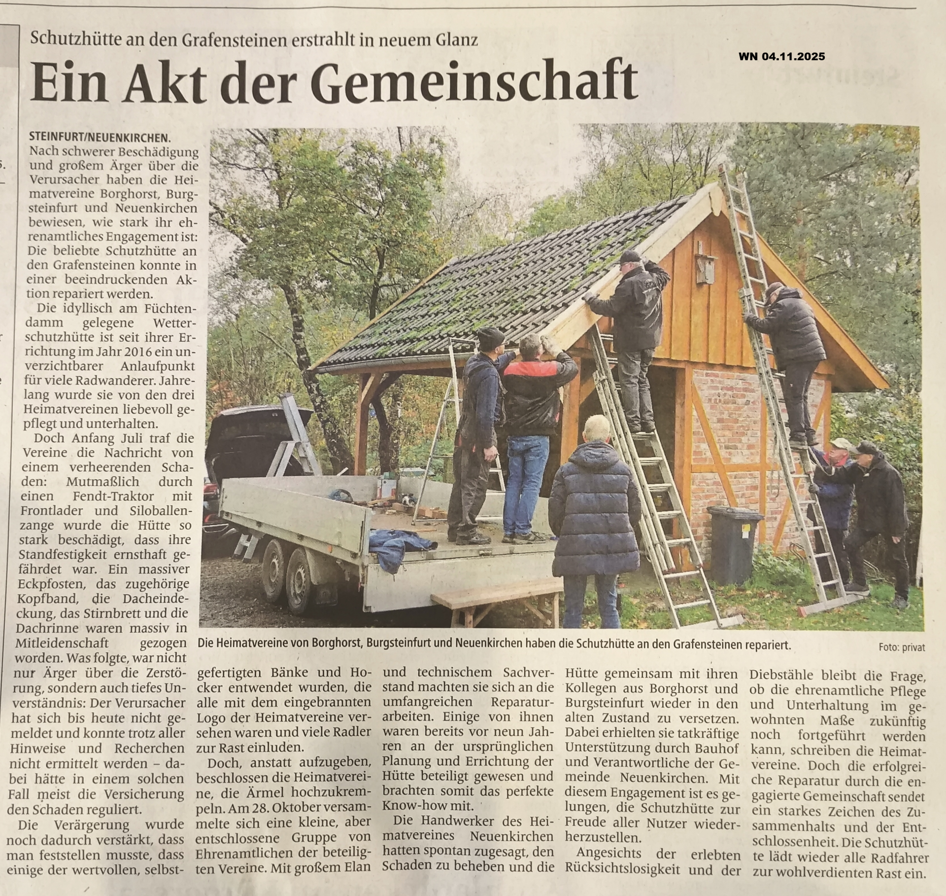 Nach schwerer Beschädigung und großem Ärger über die Verursacher haben die Heimatvereine Borghorst, Burgsteinfurt und Neuenkirchen bewiesen, wie stark ihr ehrenamtliches Engagement ist: Die beliebte Schutzhütte an den Grafensteinen konnte in einer beeindruckenden Aktion repariert werden.