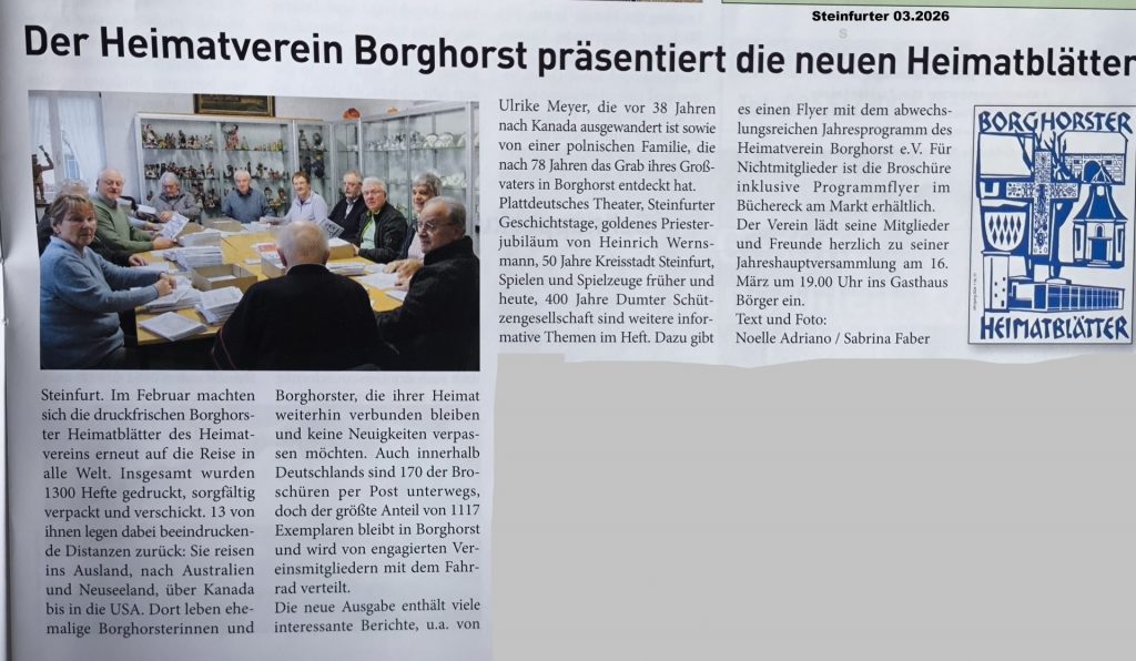 Am 23.02.2026 trafen sich Mitglieder des Heimatvereins im Heimathaus, um ca. 1300 Heimatblätter versandfertig zu machen. In den nächsten Tagen werden diese entweder per Post oder per Boten den einzelnen Mitgliedern zugestellt.Jedes Heft wurde mit dem Flyer und einem Adressaufkleber vervollständigt. Die Hefte für den postalischen Versand wurden einkuvertiert.