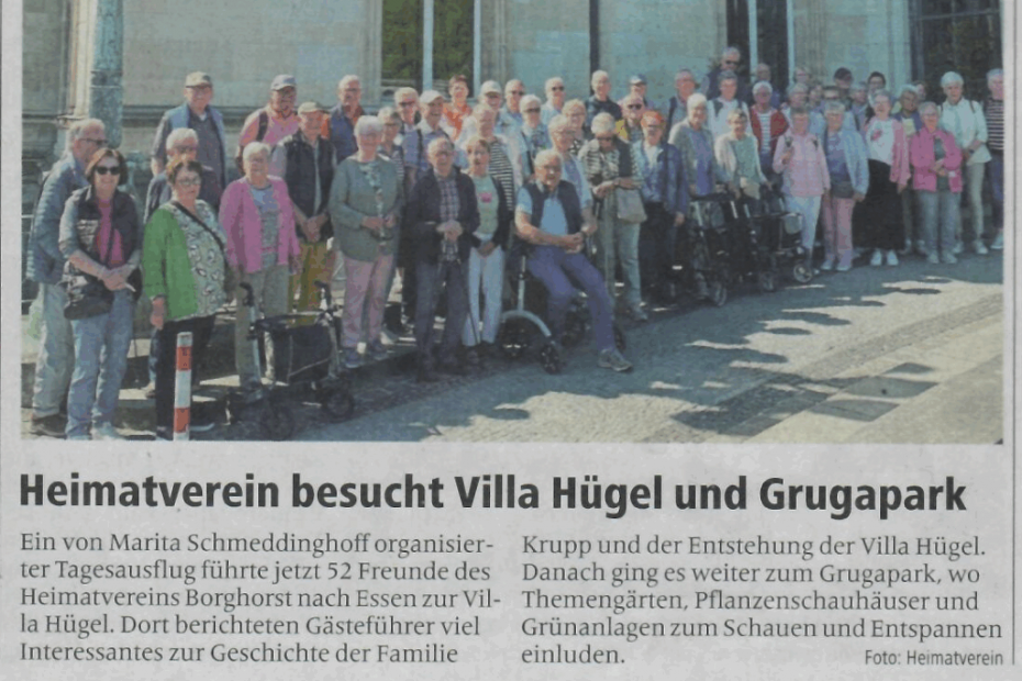 Der diesjährige Tagesausflug führte 52 Freunde des Heimatvereins Borghorst im vollbesetzten Bus nach Essen zur… Villa Hügel und Grugapark Essen