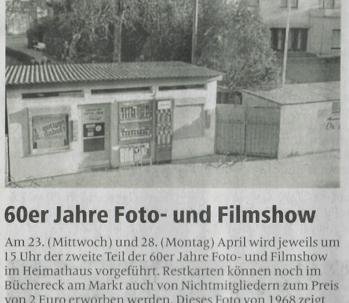 Stand 17.04.2025 Restkarten können noch im Büchereck am Markt auch von Nichtmitgliedern zum Preis von… 1960er Foto- und Filmshow Teil II